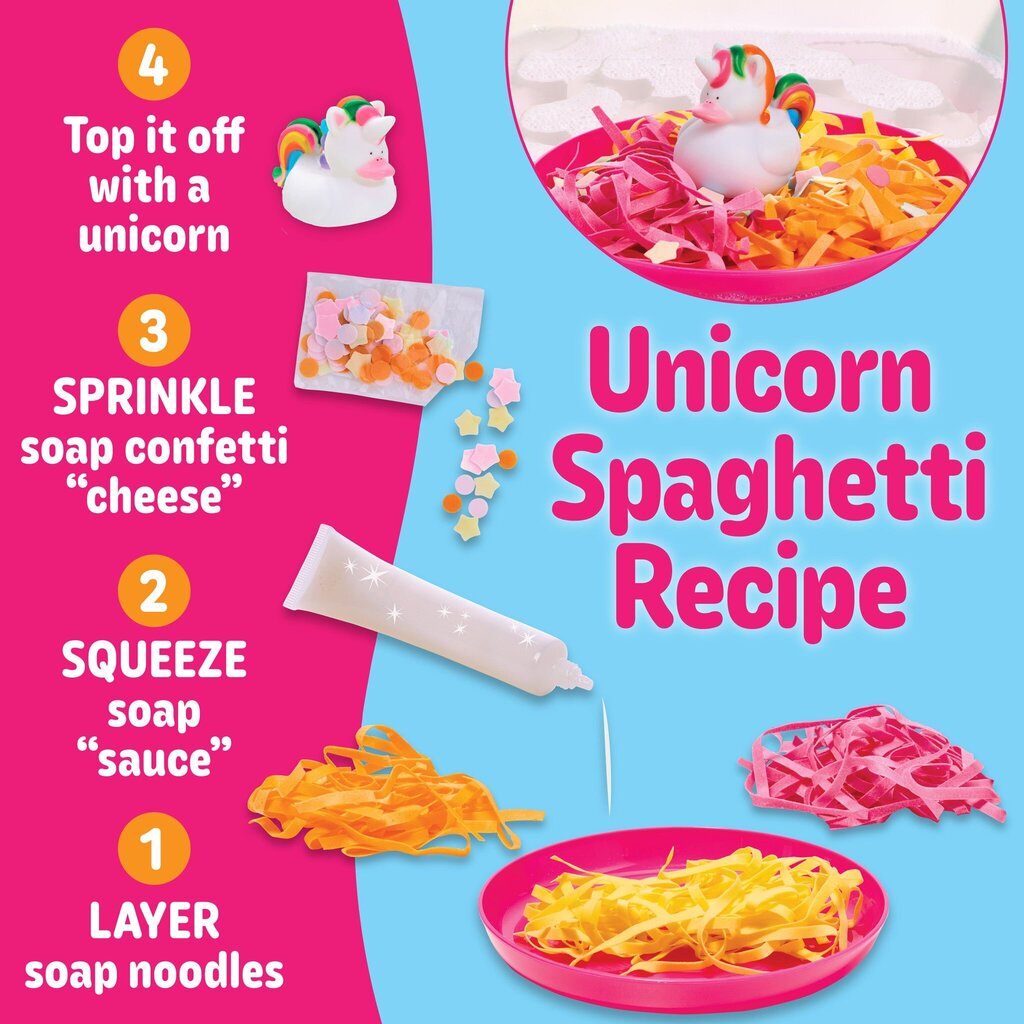 Children will love layering a rainbow array of colorful spaghetti soap "noodles," adding liquid soap sauce, and of course, rainbow sprinkle soap confetti "cheese" to top it all off.