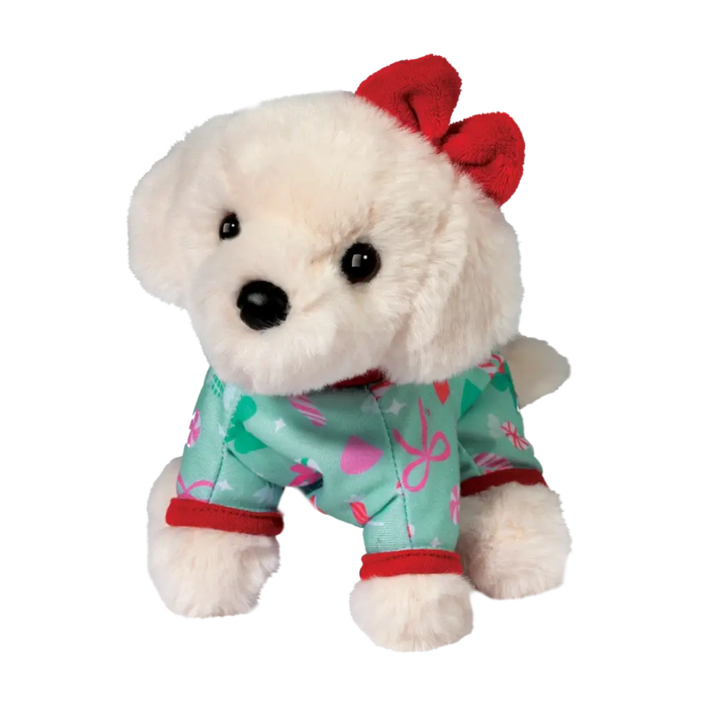 This white lab plush features a fluffy faux-fur coat, teal pajamas with a festive holiday candy design, and a soft red bow on her head. This puppy’s big, excited eyes capture the magic and wonder of Christmas day!