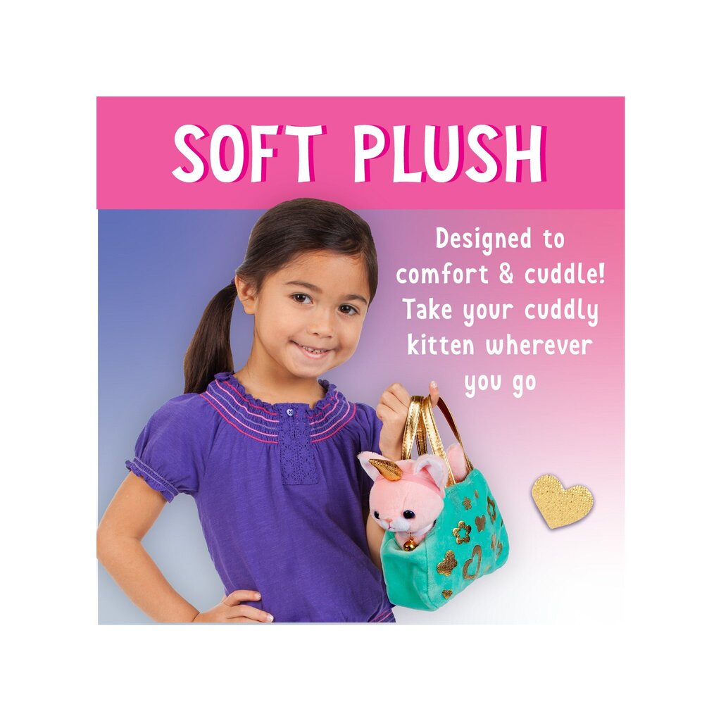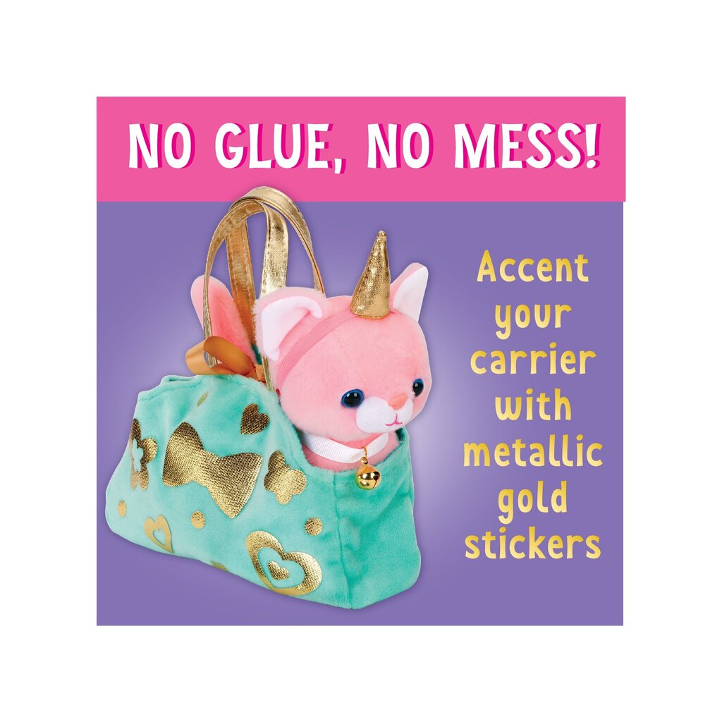 Contents Include: plush kitten, velvety pet carrier, ribbon and bell collar, metallic gold stickers, unicorn horn and shiny butterfly wings