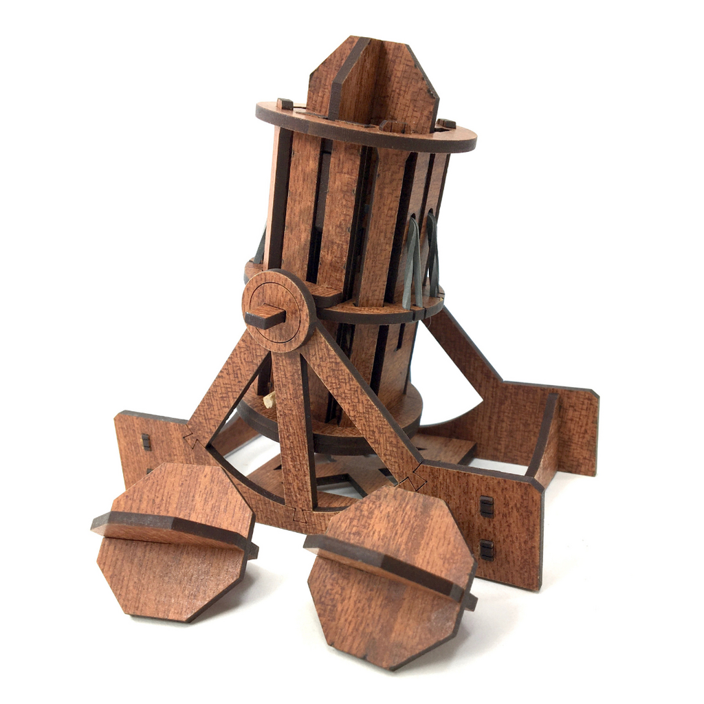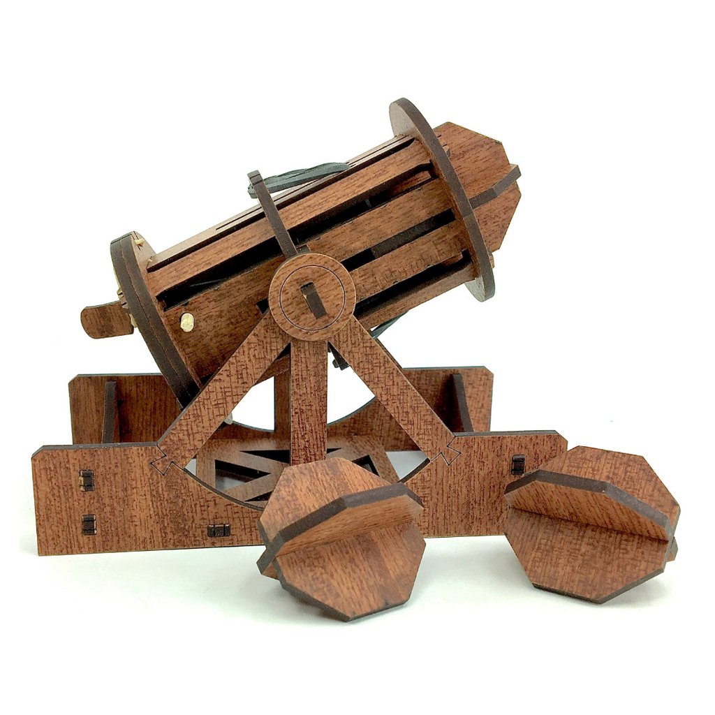This bombard re-creates one of Leonardo’s iconic images of a canon and exploding cannonballs. His notes indicated that the hollow bombs would explode close to the ground and send small projectiles in every direction. Kind of gruesome actually, but life in the Renaissance Times had wars going on – along with the great art, so these things happen. This working kit allows you to aim and launch small projectiles 5 to 10 feet – cool!