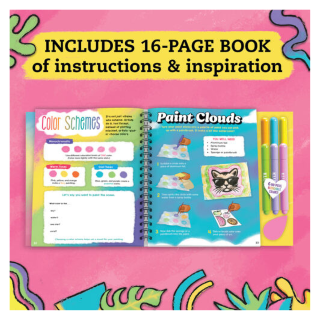 Finally, there's a way to have your very own paint studio with absolutely no mess involved! Iridescent paint sticks are the ultimate kid-friendly art media. They create bright, vibrant streaks of paint. And best of all? They dry instantly! Everything you need to get started is included, with six paint sticks, a squishy paint blender, plus 18 art boards featuring trendy illustrations. Step-by-step instructions show you how to create a variety of projects, from bookmarks to room decor with shimmering effects.