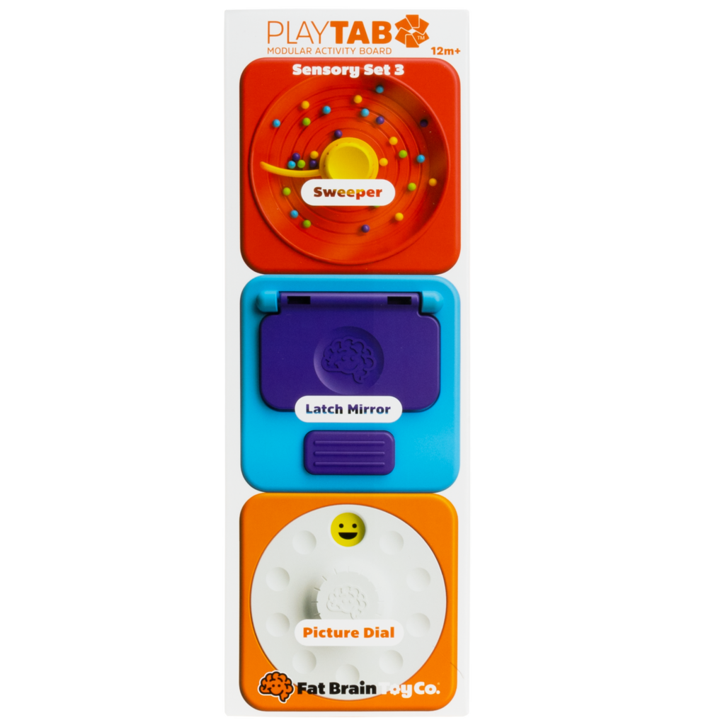 PlayTab: Set 3 is sensory fun that includes a latch mirror, picture dial, and sweeper! Each tile has a magnet on the back that sticks to the PlayTab board (sold separately) or can snap to a fridge. Bilingual, English and French.