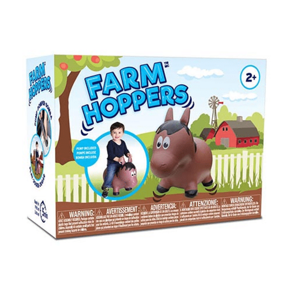 Farm Hoppers are fun, whimsical, brightly coloured, inflatable animals with soft gripable ears for children to hold onto while they bounce around. With feet touching the ground and hands holdings onto the ears, kids can bounce, scoot and walk around in a supported manner that help develop core muscle and coordination. These delightful bouncers are made from high quality BPA- free PVC and can be used both indoors and out. They come complete with their own soccer valve, needle and pump in an attractive box. The fact is that they are just plain fun and keep children highly entertained while providing and outlet for that relentless toddler energy.