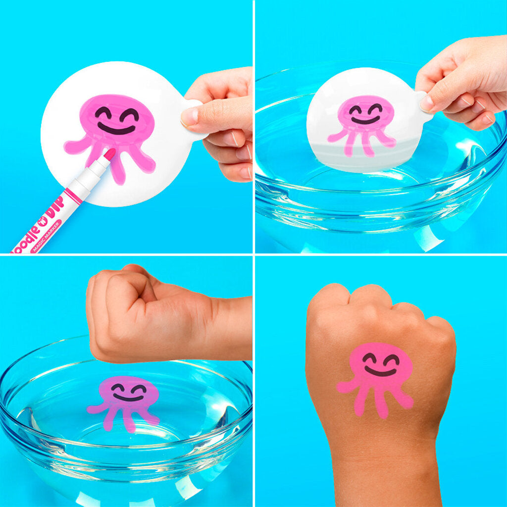 Discover Doodle N Dip tattoos, the solution for creating your own aquatic tattoos! Draw a design on the special pad, dip it gently into the water and watch your creation float away. Then place your hand over the design and watch it magically transfer to your skin.