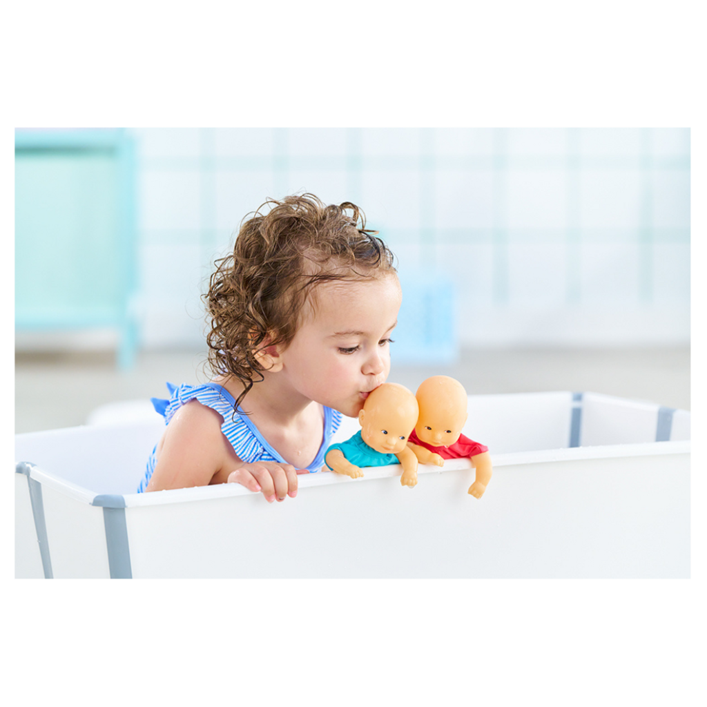8'' mini doll. Lightweight and easy to take everywhere, he's ideal for accompanying your child's daily bath and swimming trips to the pool or sea. This mini doll has white skin and painted blue eyes: his face, arms and legs are made of soft-touch vinyl, with a delicate vanilla scent. He has a pretty blue body cloth with duck silkscreen.