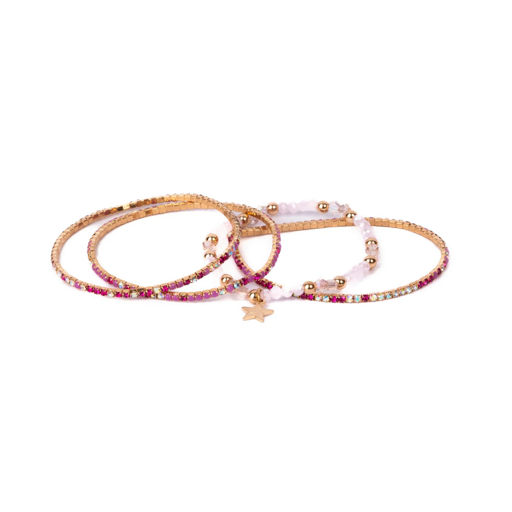 The Boutique Glam Girl Bracelet Set is the ultimate accessory for young trendsetters! This fabulous set includes three sparkling rhinestone bracelets that shine with every move, adding a touch of glam to any outfit. Paired with a stunning beaded bracelet featuring a beautiful combination of gold, white, and pink beads, this set is perfect for stacking or wearing individually.