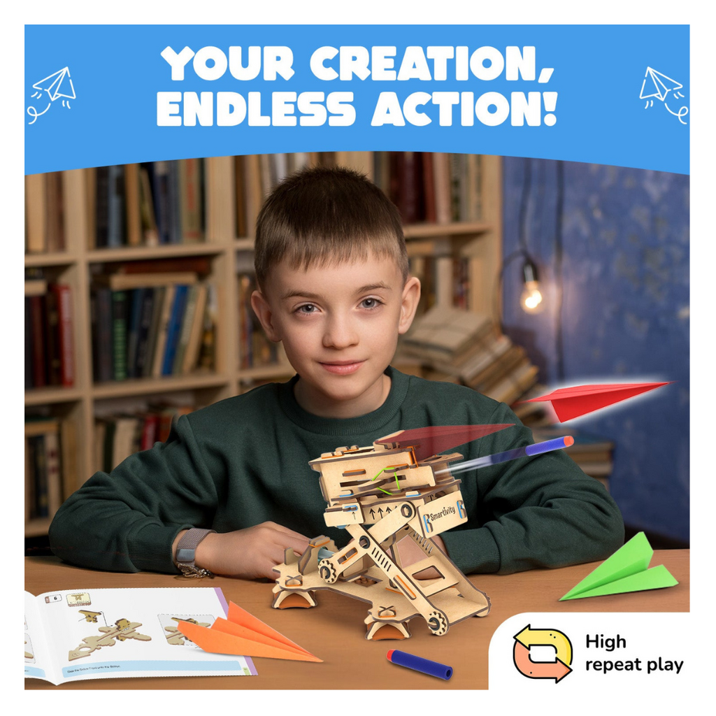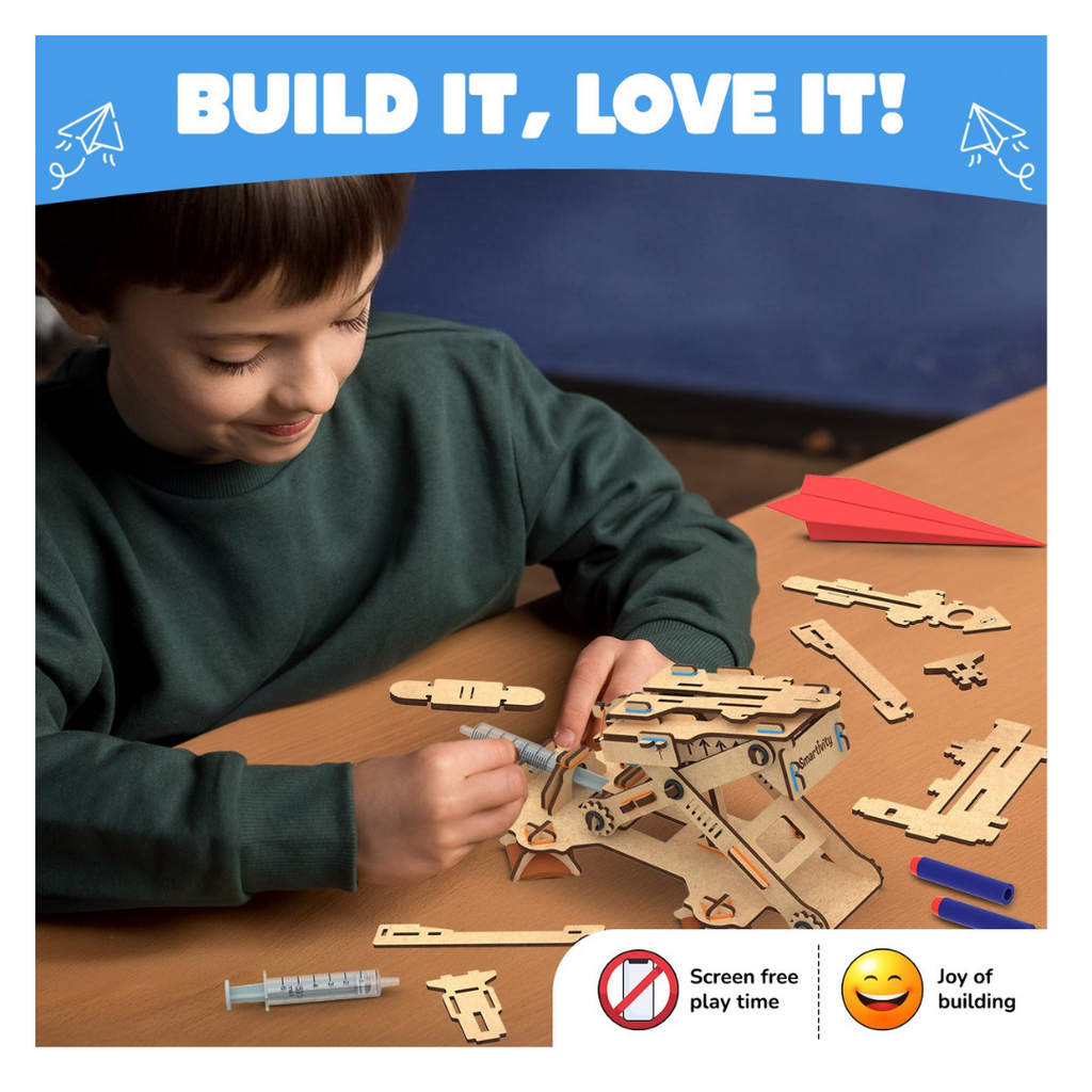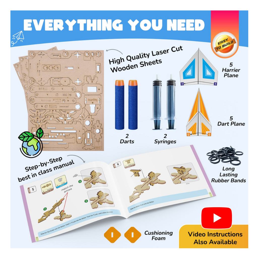 Launch Control, we are ready for launch! Jet. Set. Go! Using the fun and clear instruction booklet, construct a Hydraulic Paper-Planes Launcher.Fold the Plane. Set it on the Launcher. Press the Syringe. And watch your Paper Plane pierce through the air.What's more! You can launch Soft Missiles through the Launcher as well. Launch a full-fledged mission to attack the enemy's base.Using the Learn and Explore section, makers will tinker and explore the Forces of Flight, the Hydraulic Systems, and the working of Scissor Mechanism.